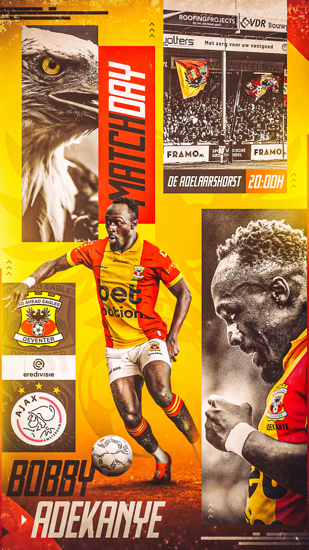 🡪 Bobby Adekanye's official matchdays and graphics. Each piece strive to foster connections with his team's supporters (Amed SK, Go Ahead Eagles and FC Crotone) and also elevate anticipation on social media, empowering the player's figure.